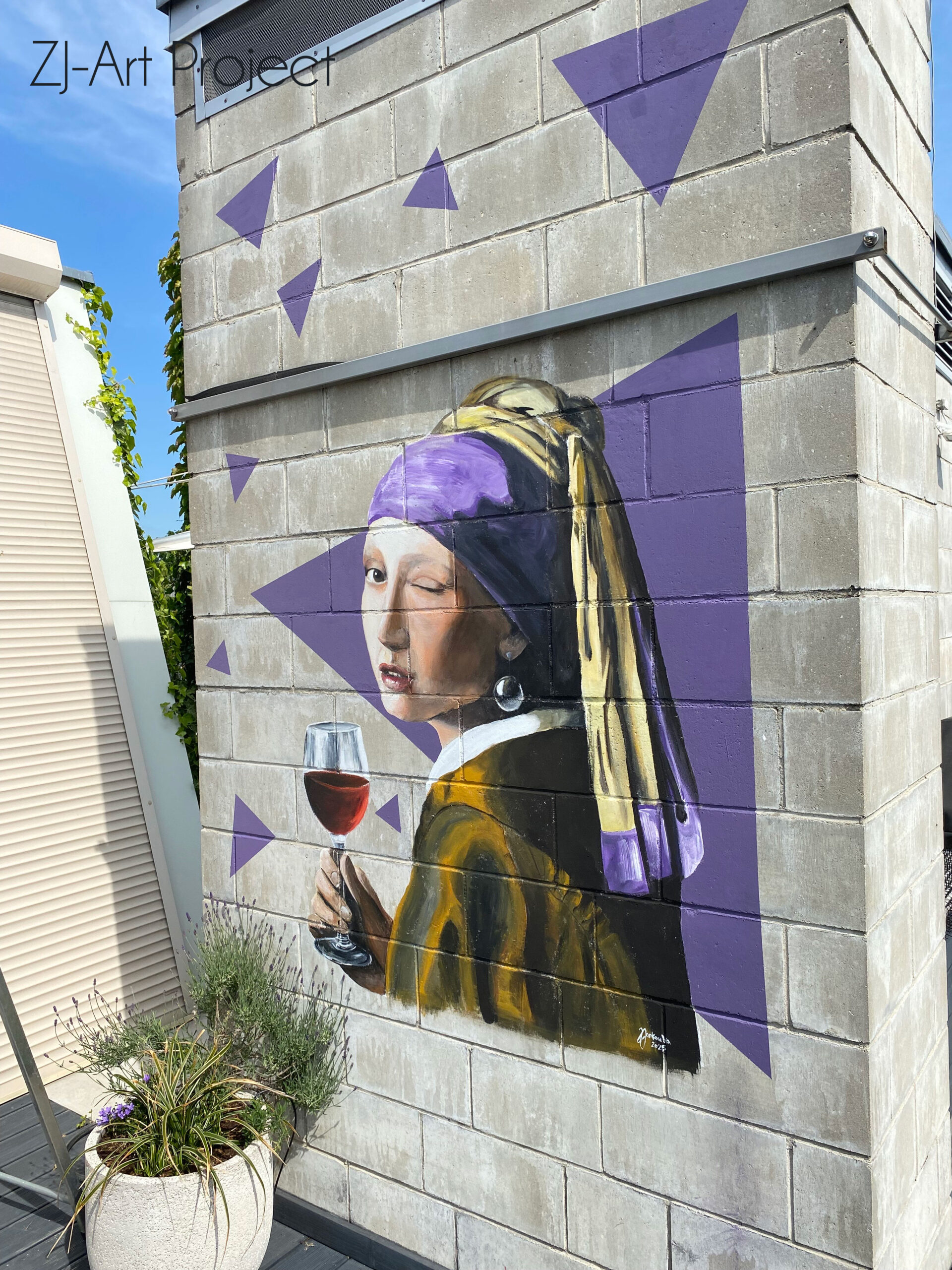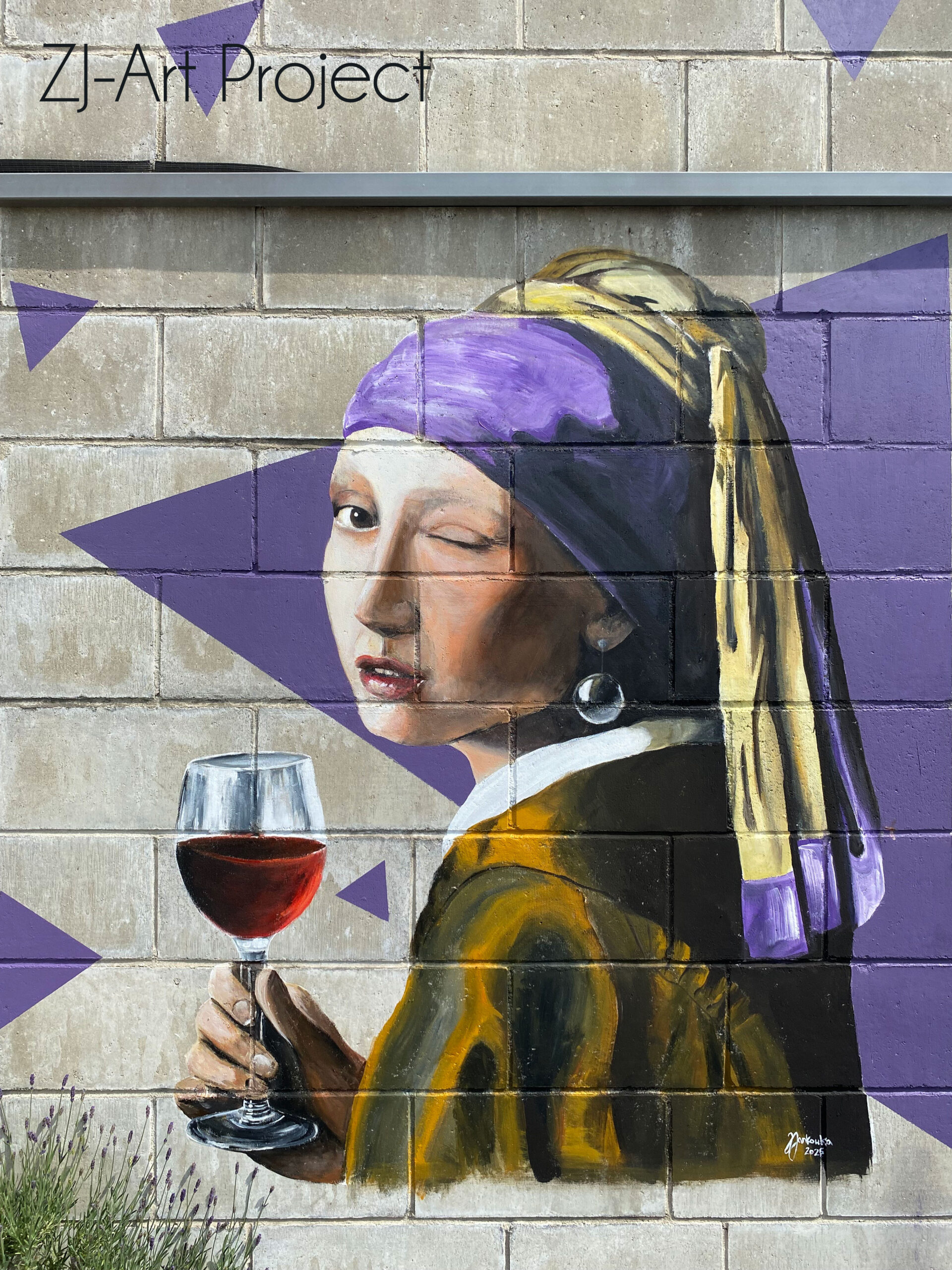 Postać dziewczyny, znana z kanonu sztuki europejskiej, została przedstawiona z przymrużeniem oka – dosłownie i w przenośni. Trzyma kieliszek czerwonego wina i mruga do widza, co nadaje kompozycji współczesnego, żartobliwego charakteru. Otaczające ją geometryczne kształty w odcieniach fioletu dodają muralowi nowoczesności i dynamiki.
